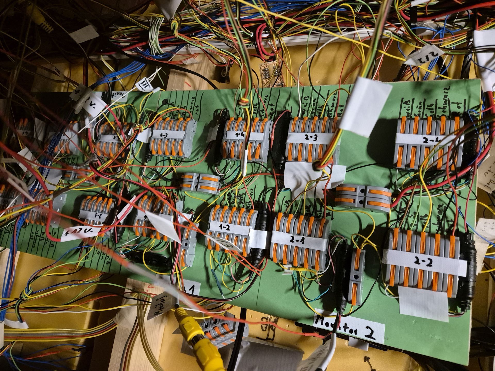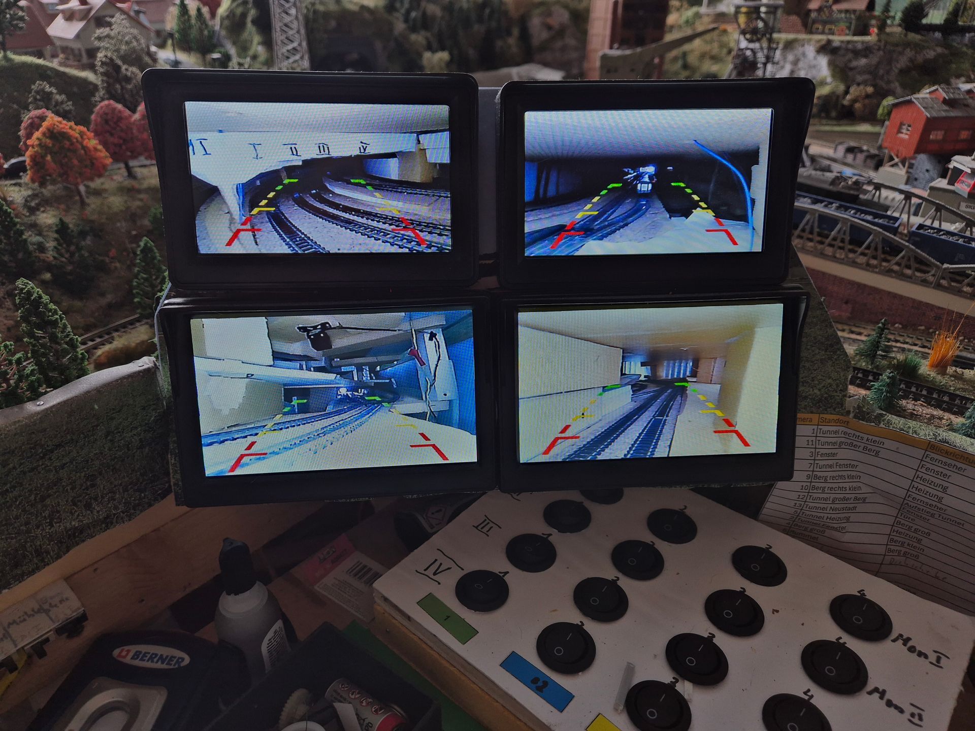 Aktuell habe ich 4 Monitore auf gesamt 7 Hauptgleise und 6 Schattenbahnhöfe mit 16 Kameras im Einsatz. Jeder Monitor kann mit jeweils 4 Kameras geschaltet werden, welche in 4 Abschnitte unterteilt sind um alle Winkel zu sehen.